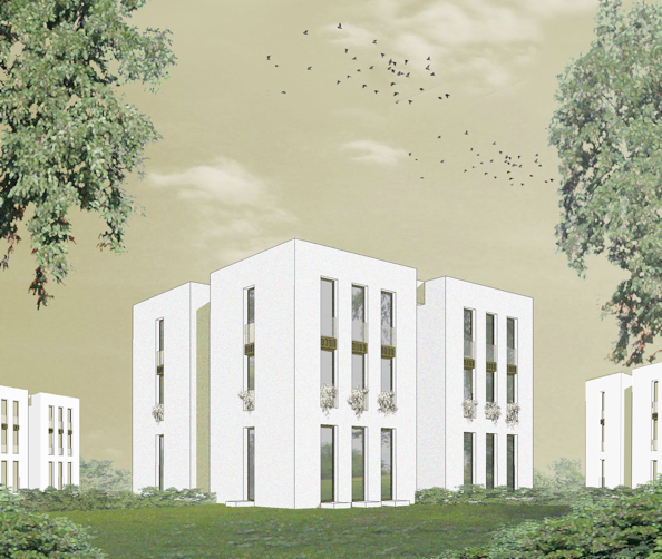 Hierbei gruppieren sich jeweils vier Einfamilienhäuser um einen gemeinsamen Hof, der sowohl eine repräsentative Empfangssituation ausformuliert und ein gesellschaftliches, öffentliches Zentrum schafft.