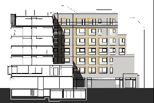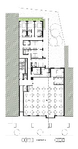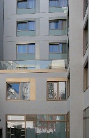 Die Hoffassade fällt durch eine Putzfassade, mit scharf gezogenen Fugengliederungen auf. Rückstufungen der Etagen formulieren eine Terrassenlandschaft, die attraktive Freiräume auf unterschiedlichen Ebenen schafft.