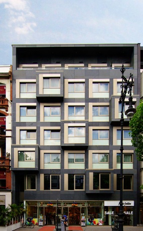 Die repräsentative Schieferfassade zum Kurfürstendamm verbindet die beiden angrenzenden Gebäude miteinander ohne an Eigenständigkeit zu verlieren.. Dies war insbesondere aus denkmalschutztechnischen Gründen wichtig, denen beide angrenzenden Baukörper unterliegen.