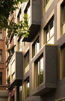 Die Fassade ist klassisch gegliedert und thematisiert spielerisch das traditionelle Stadthauselement des Erkers in Form von hervortretenden Kuben, die in den Stadtraum eindringen und Ihn prägnant formen.